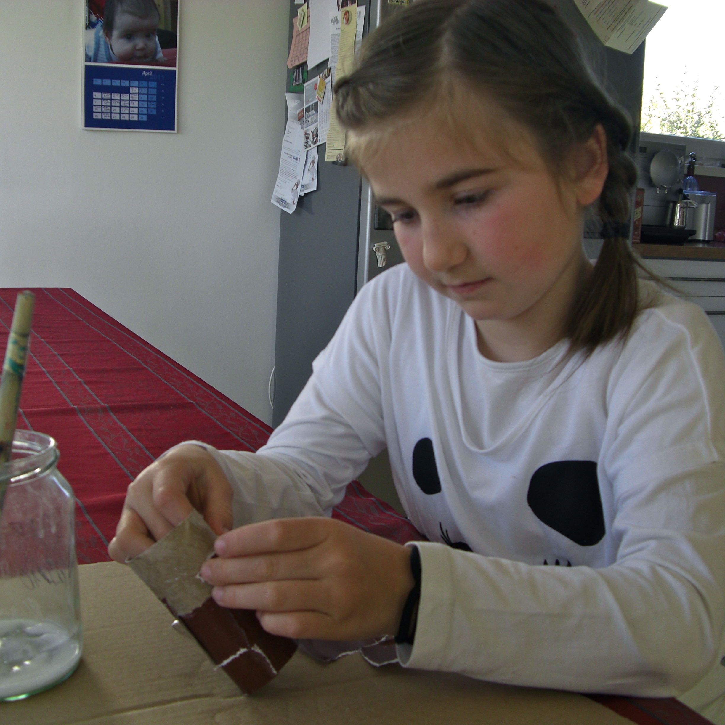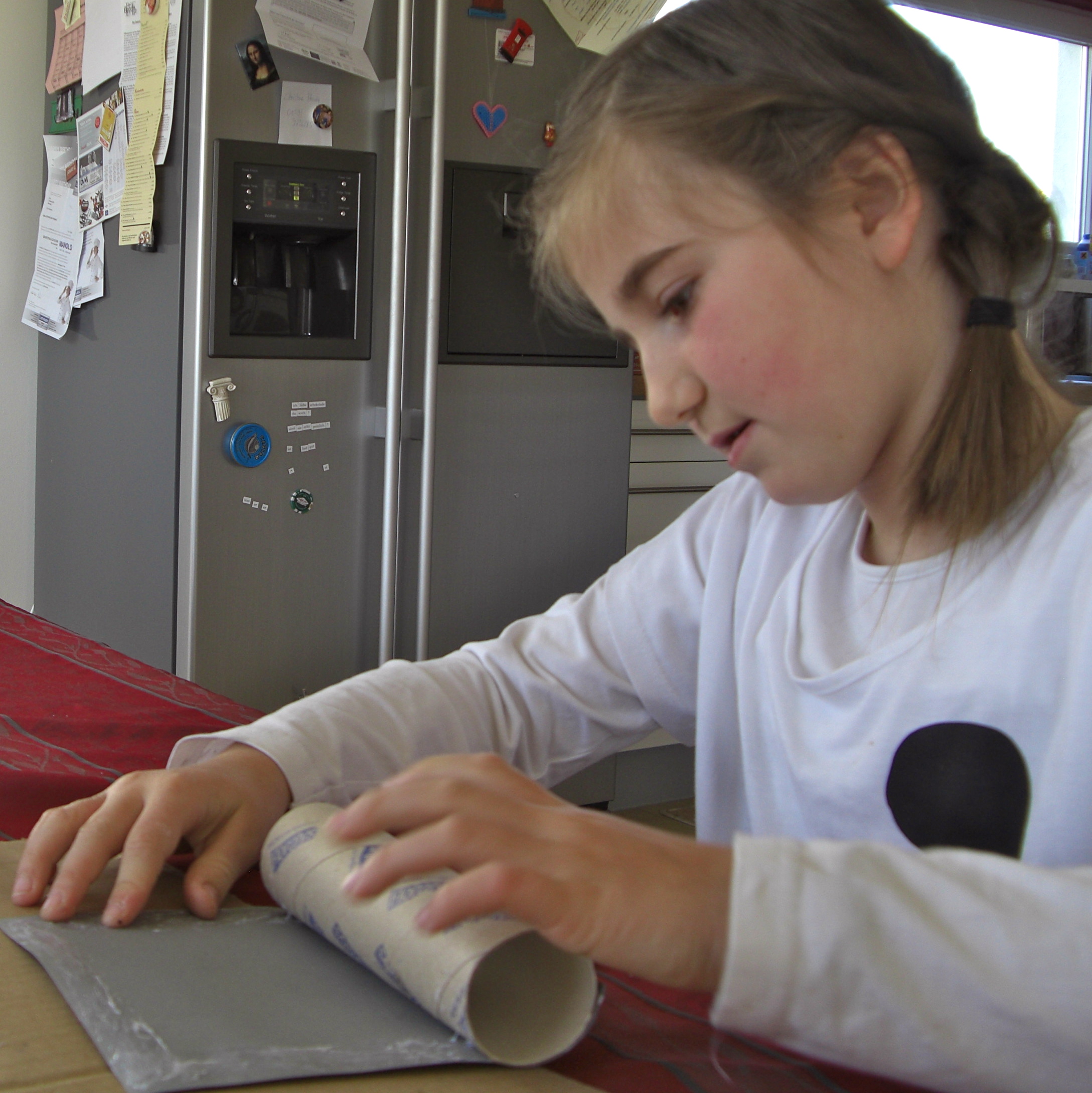 Die Rolle mit Kleister bestreichen und mit den Papierschnipsel bekleben.