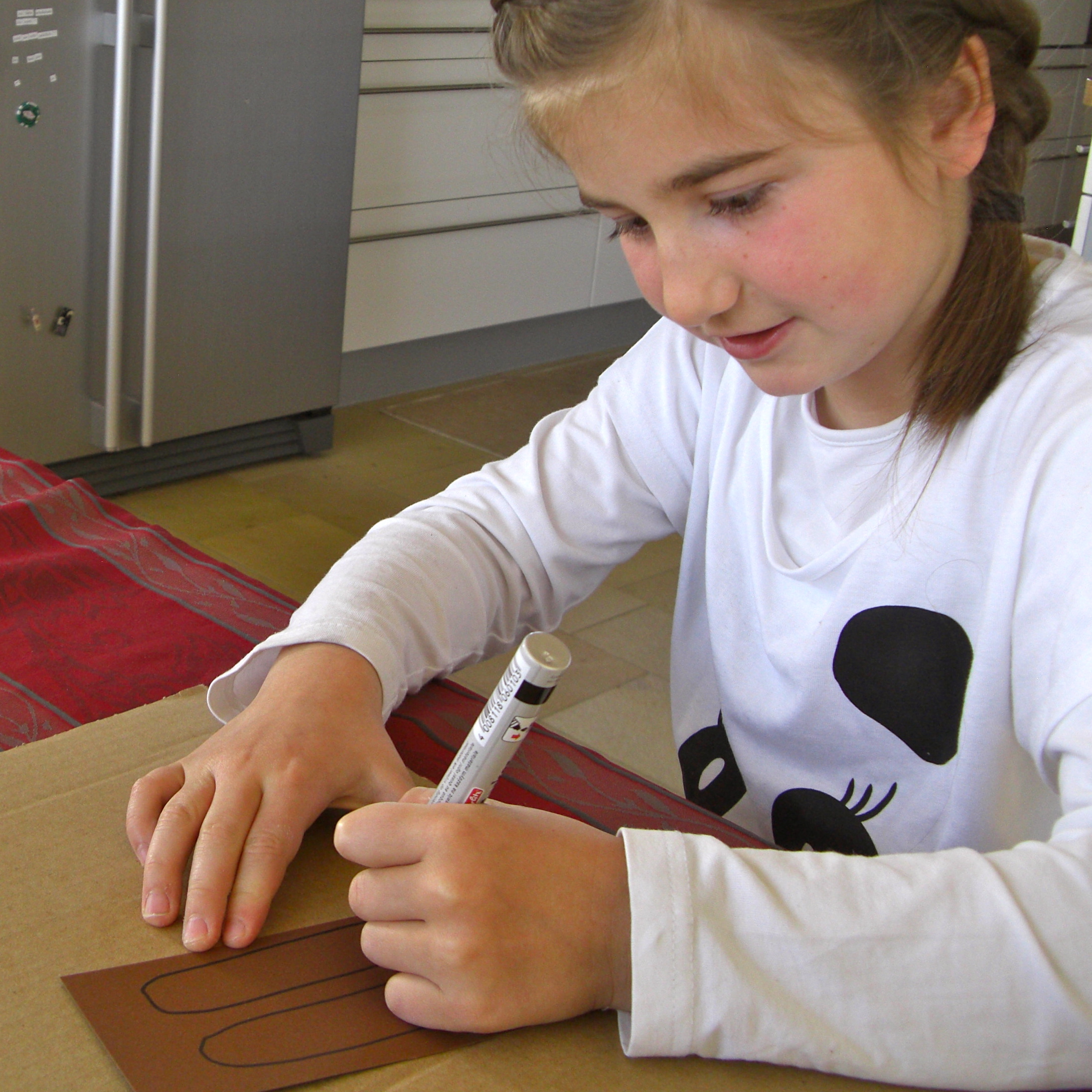 Schnurrbarthaare und die Nase werden auf das braune Papier gezeichnet, ausgeschnitten und geklebt.