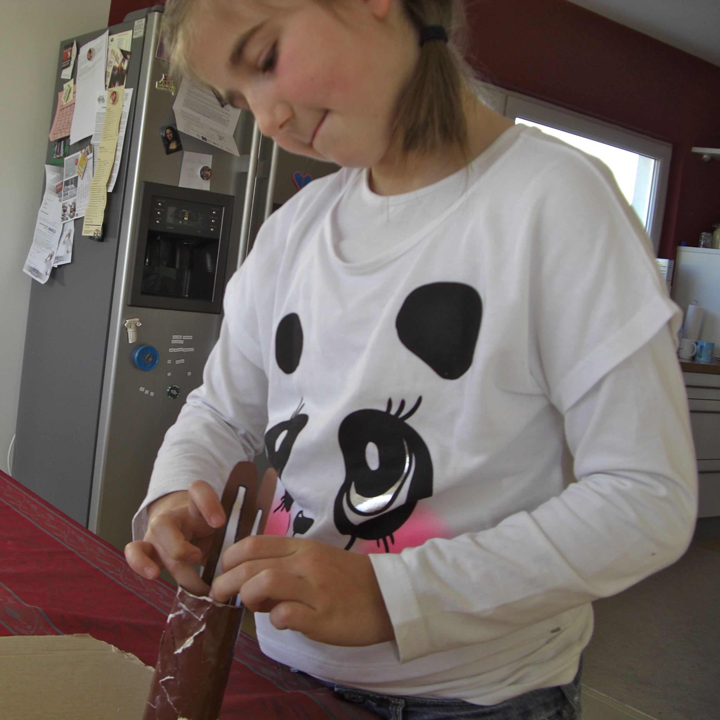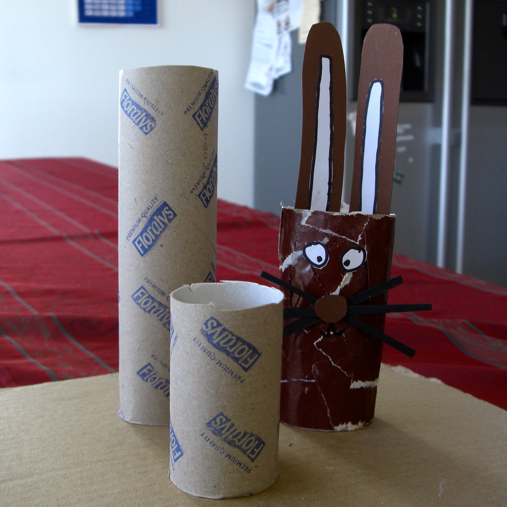Eine Küchenpapierrolle wird gedrittelt. Das größere Stück wird der Osterhasenpapa, und das kleinere das Osterhasenkind.