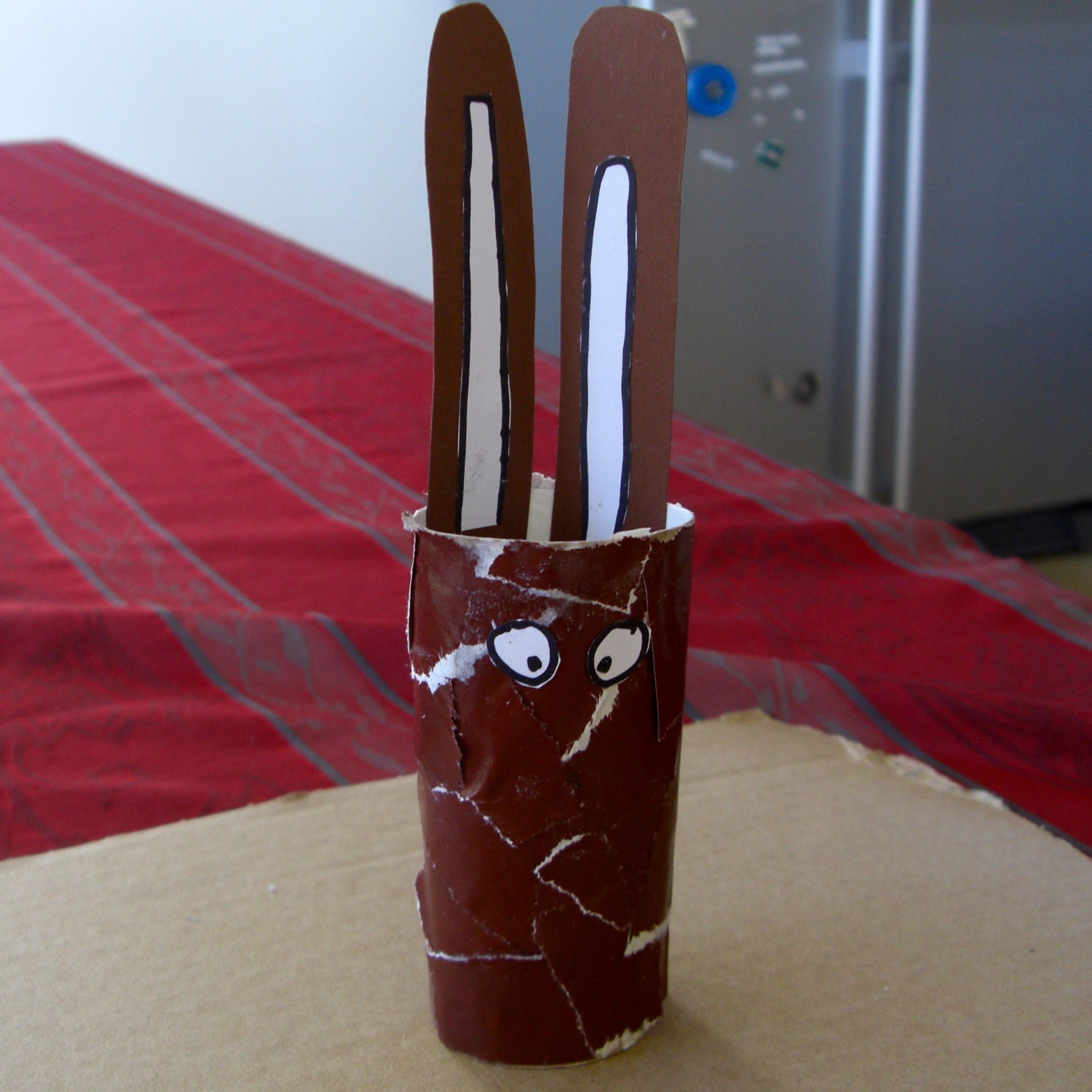 … und dann die Rolle bekleben. Geht am Einfachsten, wenn man die Rolle anlegt und dann rollt. Der Rest ist wie bei der Osterhasenmama: Ohren, Augen … und dann alles noch einmal für das Osterhasenkind.