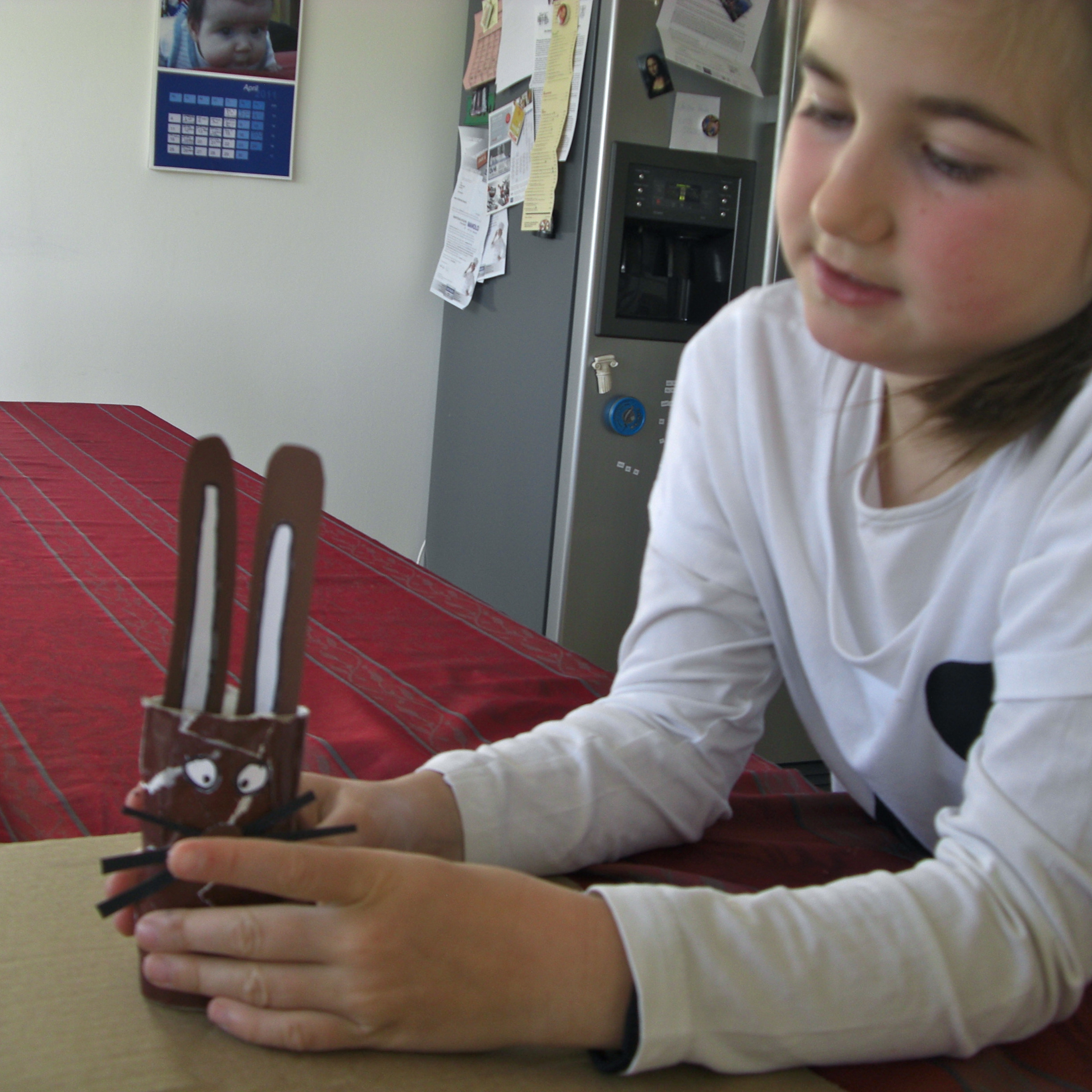 Aus weißen Papier Augen ausschneiden und mit einem Stift die Pupillen einzeichnen. Damit die Hasenfamilie auch lustig wird hat Sophia die Augen so angeklebt, dass die Osterhasenmama schielt.