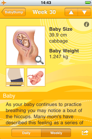 Die englische App soll alles rund um die Schwangerschaft abdecken und wir haben zwei Funktionen intensiv benutzt und für nützlich befunden. Wie eigentlich immer ist eine IPhone-App nichts was sein Leben verändert aber doch ein kleines Stück erleichtert.