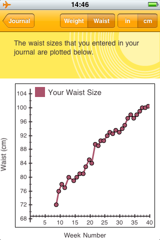 Zum einen haben wir das Gewicht und den Bauchumfang jede Woche eingetragen und hatten durch einen eingetragenen Korridor in der Übersichtsgrafik eine gewisse Bestätigung das die Entwicklung auf den richtigen Weg ist. Auch die Stimmung kann man eintragen, aber wir haben da keinen Nutzen für uns entdeckt. Also es gibt eine Grafik für den Bauchumfang und eine für das Gewicht.