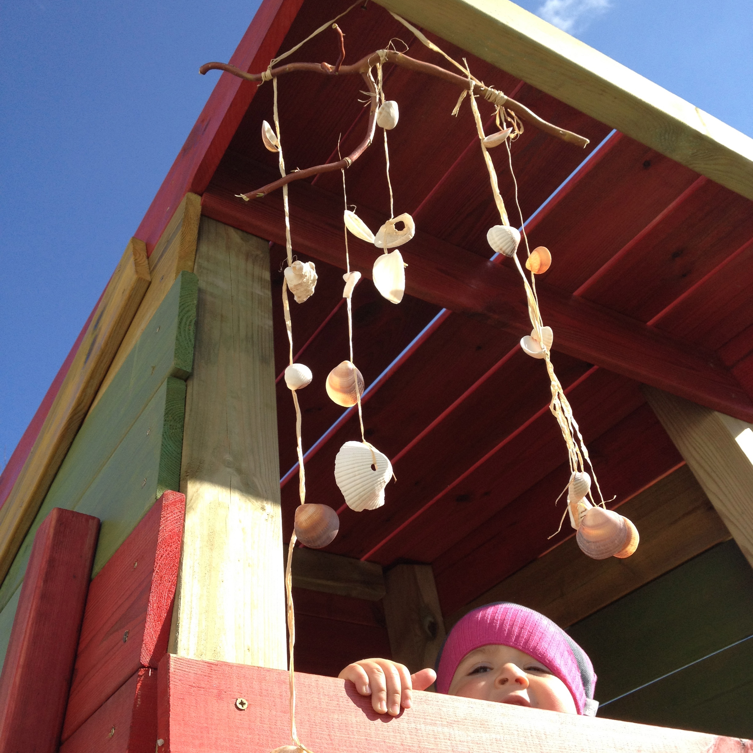Muscheln ggf. Anbohren (meine hatten vom Meer alle eine kleine Bruchstelle, die ich als Fädelloch nutzen konnte) und an Bast knoten. Einzelne Muschelketten an den Ast binden und diesen dann ans Spielhaus hängen. Die Deko kann aber auch für jede andere Stelle im Garten oder auch Haus (z. B. Badezimmer) genutzt werden.