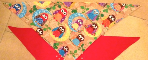 Den Eulenstoff zu einem Quadrat zu schneiden. Am Einfachsten geht dies, wenn man den Stoff zu einem Dreieck legt und dann schneidet. Zum Nähen den Stoff auf links zu einem Dreieck legen, also bedruckte Seite nach innen, und dann die beiden Teile zusammen nähen. Dabei an einem Ende ca 8 cm offen lassen, damit man das Tuch noch auf rechts wenden kann. An den drei Ecken die entstandenen Stoffspitzen abschneiden, damit es keine dicken Knubbel an den Ecken gibt. Das Stoffdreieck auf rechts drehen, bei den Ecken ggf. mit einer Stricknadel die Ecken noch etwas heraus schieben. Danach das Tuch bügeln und dabei an der offenen Stelle die Kanten nach innen bügeln. Um diese Seite noch zu verschliessen im Anschluß daran einfach einmal das ganze Tuch säumen. Dadurch werden alle Seiten verschlossen und es entsteht eine Ziernaht.
