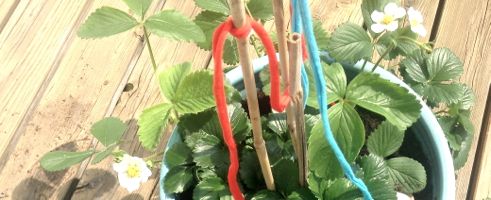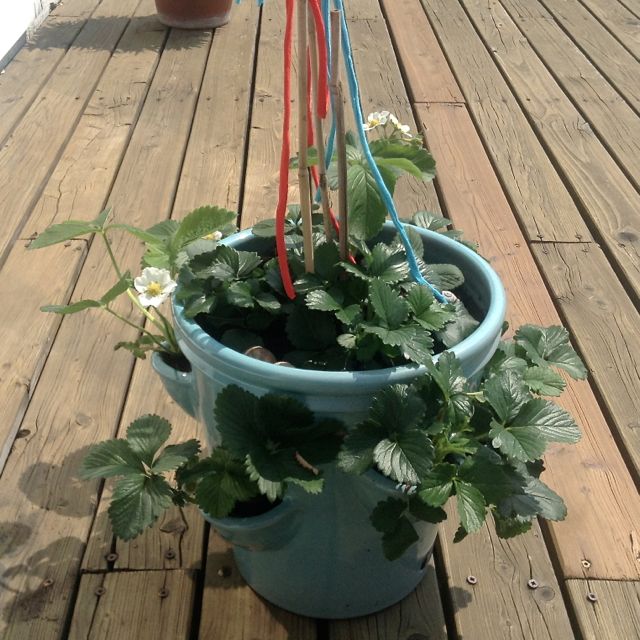 Der Kräutertopf ist schnell bepflanzt. Ich habe die Pflanzen von innen durch die seitlichen Löcher „gefädelt“ und erst danach den ganzen Topf mit Erde befüllt. Ein paar Bambusstäbe und Bänder sorgen für Farbe, bis die Erdbeeren rot leuchten.