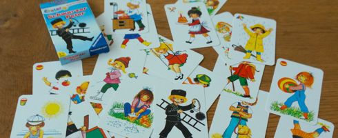 Die Regeln muss ich glaub ich nicht erklären. Jeder zieht von seinem Nachbarn eine Karte, legt ein Paar weg …. bis am Ende nur noch der schwarze Peter über ist. Derzeit ist die größte Schwierigkeit, die Karten in der Hand zu halten.
