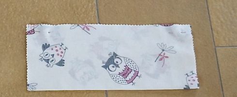 Aus dem Eulenstoff schneide ich außerdem noch einen 8 cm breiten und 70 cm langen Streifen für den Henkel, so wie einen 27 cm breiten und 30 cm langen Streifen für eine Einstecktasche auf der Taschenklappe.