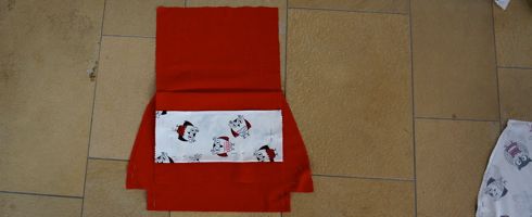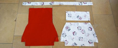 Da ich eine Kindergartentasche mit Klappe haben will verlängere ich das Schnittmuster für den roten Stoff um 20 cm. Bei meiner Tasche ist der lange Stoff der rote (2x zuschneiden) und der kurze der Eulenstoff (2 x zuschneiden).