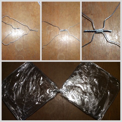 Geschenkfolie entsprechend des Metallgestells abschneiden und mit Heißkleber ankleben. Ich habe dabei „unsauber“ gearbeitet, damit die Flügel ein Muster erhalten. Damit die Folie nicht gleich reißt habe ich drei Lagen übereinander geklebt. Die überstehende Folie kann man wegschneiden oder – so wie ich – einfach einfalten und mit ankleben.