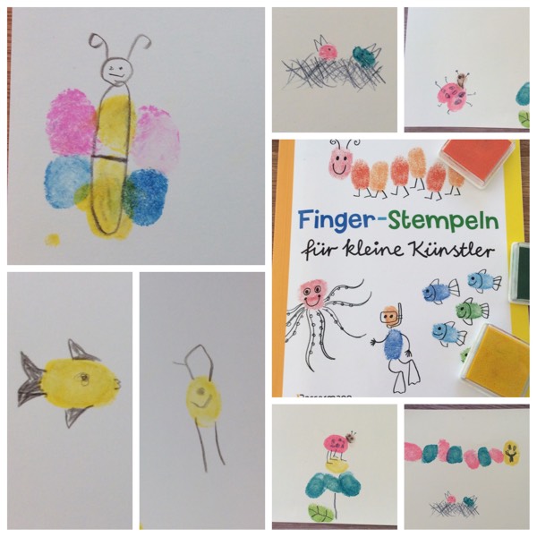 Anregungen holten wir uns aus dem Buch „Finger-Stempeln für kleine Künstler“ vom Bassermann Verlag.